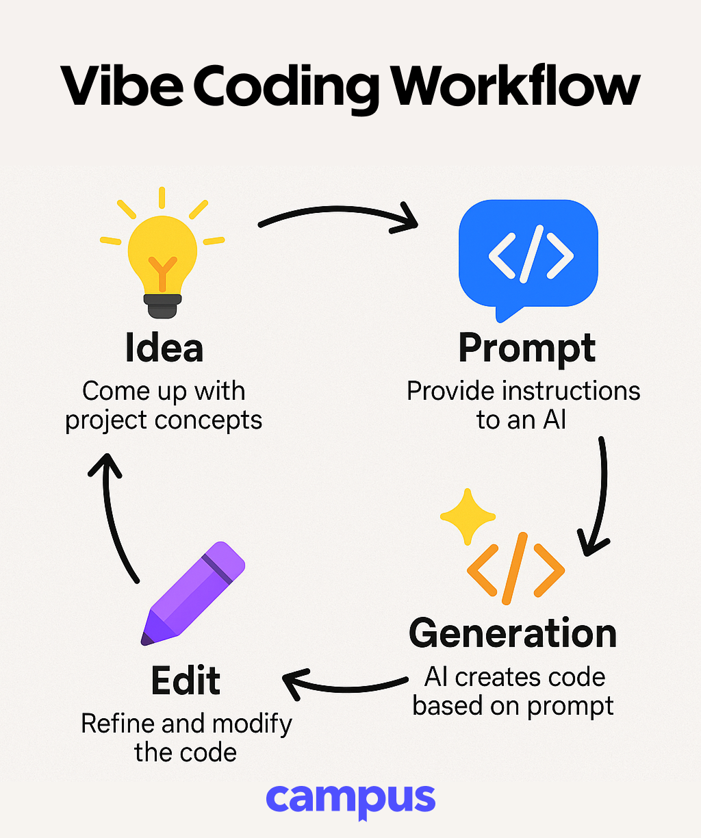 In its essence, vibe coding is all about blending human creativity with the power of AI by turning your ideas into real, working projects faster than ever. The workflow below shows how it all comes together: start with an idea, craft a prompt, let AI generate your code, and finally implement and publish your masterpiece. It’s not just coding, it’s co-creating alongside technology.